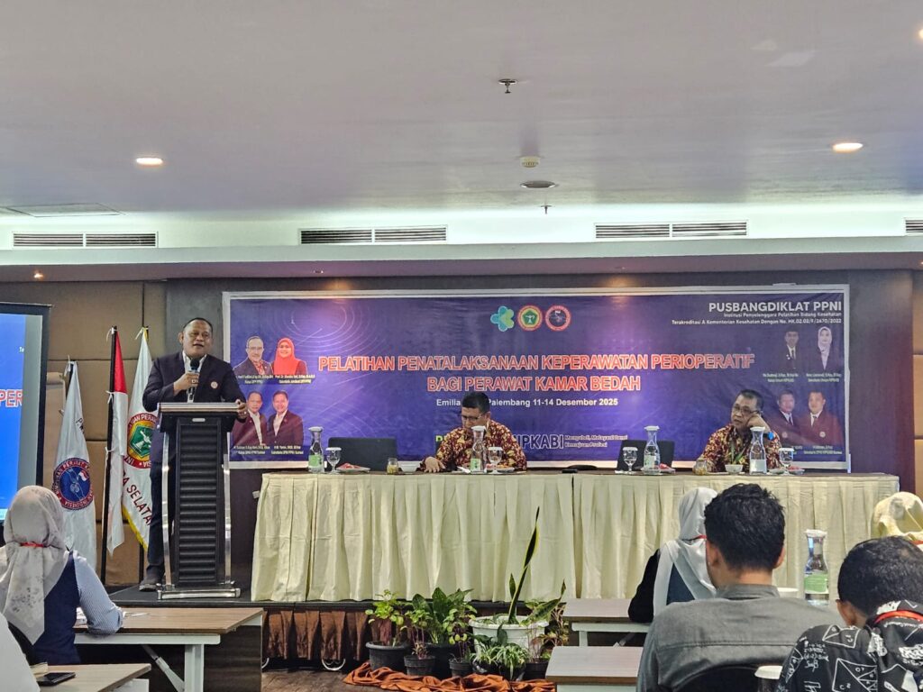 Kegiatan dilakukan pada 11-14 Desember 2025 di Emilia Hotel Palembang, Pusbangdiklat PPNI menyelenggarakan pelatihan penatalaksanaan perawatan perioperatif bekerja sama dengan HIPKABI sumatera Selatan guna meningkatkan pengetahuan dan keterampilan perawat dalam memberikan asuhan perioperatif yang aman dan berkualitas